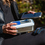Připravte se na chutná dobrodružství se sadou příborů Monbento Slim Box v modré barvě! Vidlička, nůž a lžička jsou uložené v pevné krabičce a budou vás provázet na túrách, při kempování, v práci nebo dokonce na víkendových piknicích. Díky odnímatelnému pouzdru lze tyto opakovaně použitelné příbory uložit také přímo pod horním víkem svačinového boxu Monbento. Dokonalá sada příborů na oběd v přírodě!