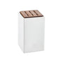 Do vysoce kvalitní keramické dózy můžete uložit až 6 nožů s délkou čepele až 16 cm. Odpovídající víko z krásného dřeva Sapeli má 6 otvorů pro 3 malé a 3 střední nože. I bez víka slouží dóza svému účelu: například k ukládání kuchyňského náčiní. Krásná kombinace materiálů bílé keramiky a dřeva Sapeli vytváří velmi příjemný kontrast.