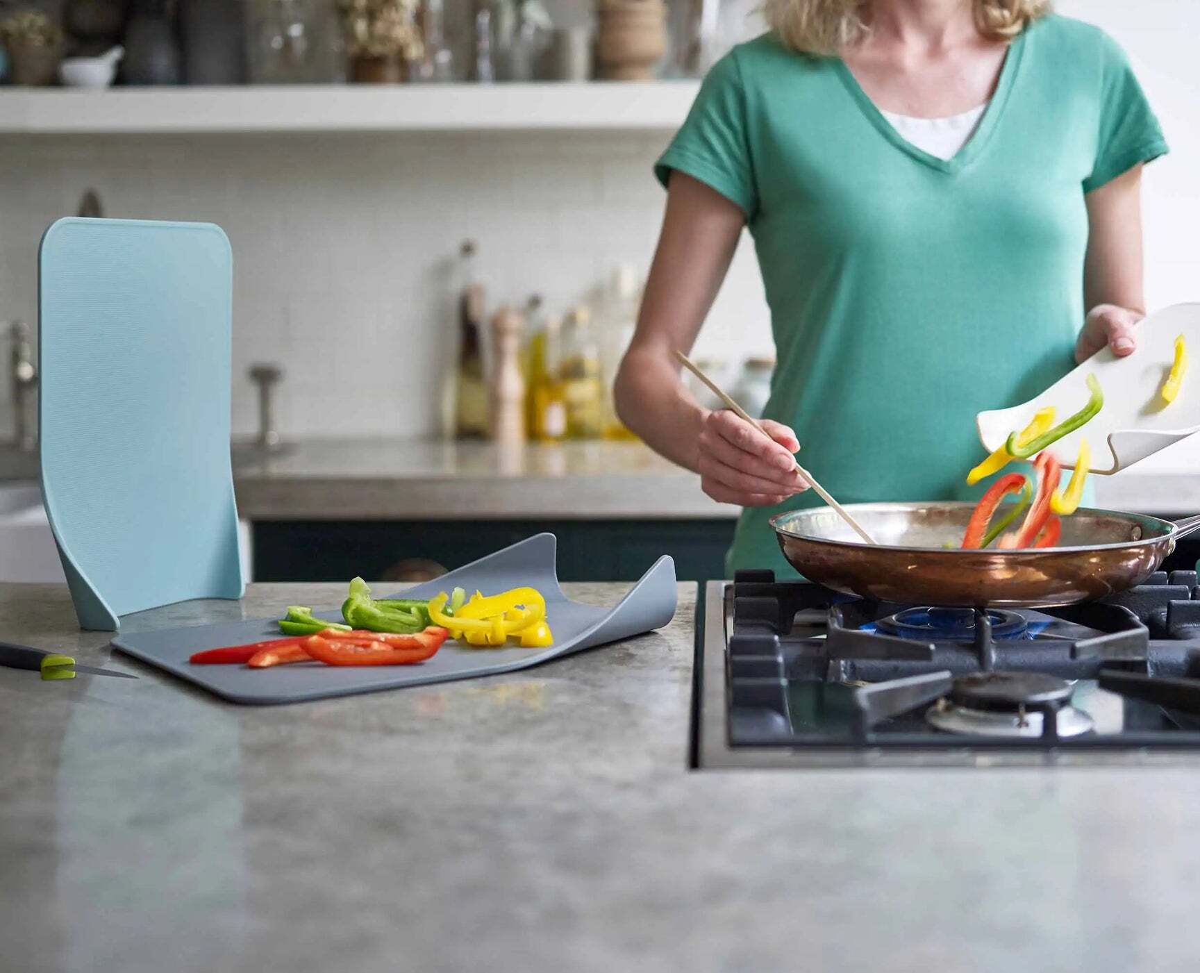 The three different sized chopping boards in this set can be placed at the edge of the worktop and joined together to take up less space in the kitchen.