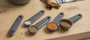 The KitchenAid measuring spoon set includes five different sizes: ¼ teaspoon (1.25 ml), ½ teaspoon (2.5 ml), 1 teaspoon (5 ml), ½ tablespoon (7.4 ml) and 1 tablespoon (15 ml).The measuring cups are suitable for measuring liquid and dry ingredients.They are durable and BPA-free, with the size in metric and imperial measurements printed in legible letters on each handle.Measuring cups are connected by a ring for easy organization and storage. Dishwasher safe for easy cleaning (top rack recommended).