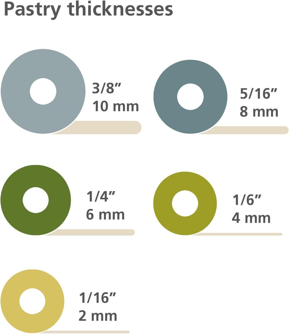 Nastaviteľný valček vám pomôže vyvaľkať cesto dokonalej veľkosti. Obsahuje päť odnímateľných krúžkov, ktoré sú farebne označené a umožňujú nastaviť požadovanú hrúbku vyvaľkaného cesta na 2, 4, 6, 8 alebo 10 mm. Jednoduchým pootočením odstráňte krúžky, ktoré nepotrebujete, a môžete váľať. Povrch valčeka je označený meracou čiarou od 140 mm do 340 mm.