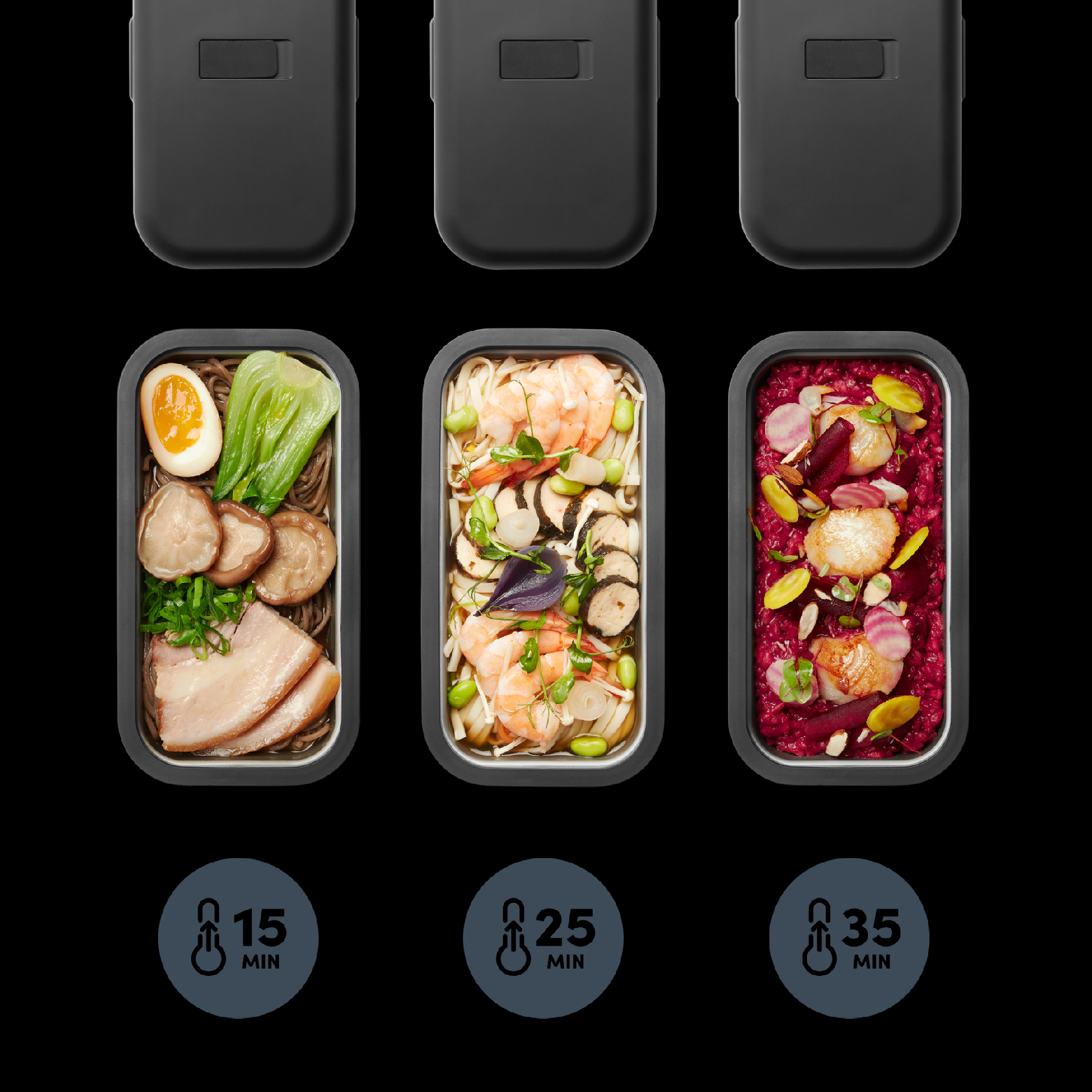 Ohrievací box na občerstvenie Monbento Warmer je ideálnym partnerom na rýchle ohriatie jedla a zdravé stravovanie, nech ste kdekoľvek! Tento elektrický ohrievací box s 3 programami ohrevu vám umožní ľahko ohriať jedlo za 15 až 35 minút a zároveň zachovať všetky chute, štruktúru a výživové vlastnosti surovín.Po ohriatí si jedlo udrží svoju teplotu až 1 hodinu!Vďaka objemu 700 ml a dokonale tesniacemu viečku je elektrický ohrievač desiat Monbento Warmer vzduchotesný a umožňuje ľahko si vychutnať výdatné teplé jedlo v kancelárii, na cestách alebo v aute.